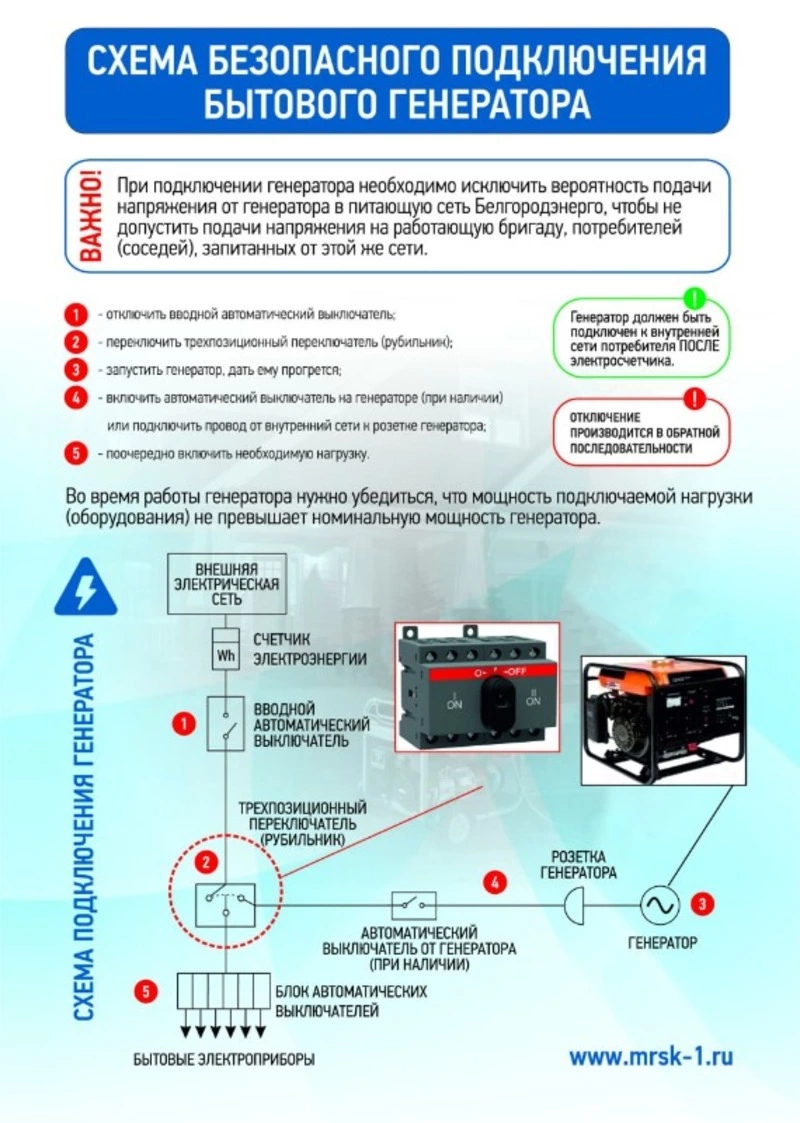 Филиал «Россети Центр» - «Белгородэнерго» напомнил потребителям, устанавливающим индивидуальные дизельные и бензиновые генераторы, что подключать их нужно чётко в соответствии с инструкцией и обязательно после электросчётчика. Это необходимо для того, чтобы исключить электроэнергию, выработанную генератором, из расчётных платежей.